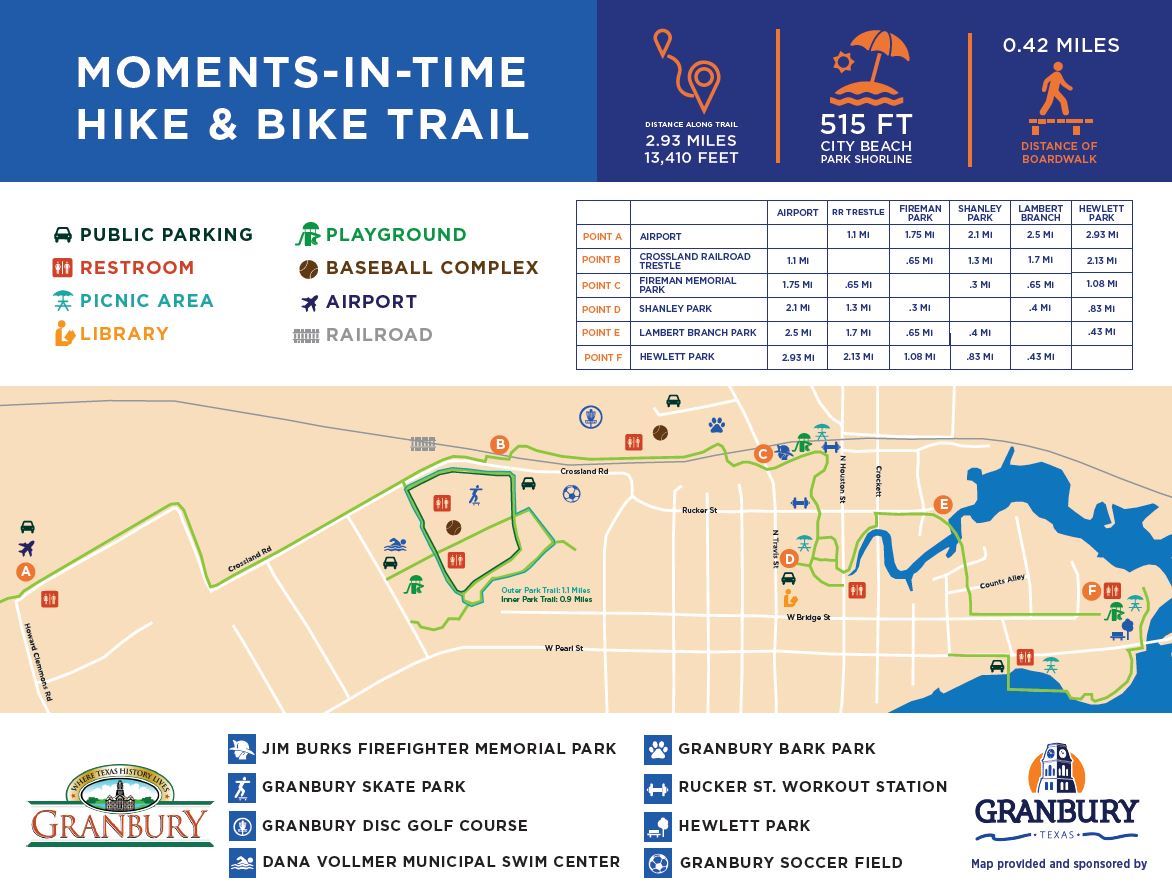 The Moments in Time Hike & Bike Trail was built in 2006. It is an eight-foot wide concrete trail traversing 2.93 miles from the Granbury Airport to Hewlett Park. Parking locations and restroom facilities are located along the trail. View a map of the Trail